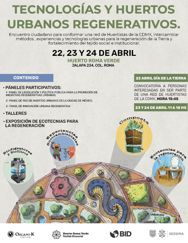 Encuentro ciudadano para conformar una Red de Huertistas de la Ciudad de México e intercambiar saberes para la regeneración de la tierra y el fortalecimiento del tejido social e institucional. Te invitamos a celebrar con nosotr@s el Encuentro de Saberes y Experiencias sobre Ecotecnologías y Huertos Urbanos • Tendremos actividades educativas, conferencias sobre medioambiente y exposición de proyectos para practicar en casa. • En el evento podrás relacionarte con otras y otros como tú, así como con asociaciones civiles, universidades y gobiernos para que junt@s cultivemos de alegría nuestra gran ciudad. Asiste al Huerto Roma Verde en la Calle de Jalapa 234, Col. Roma